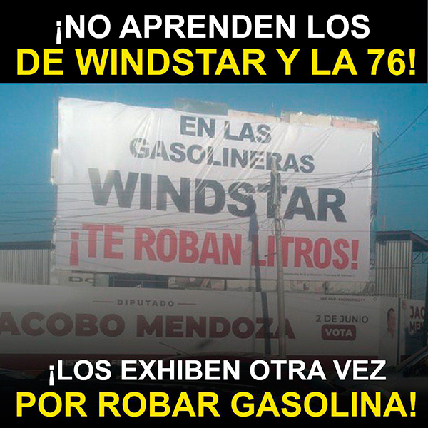 Semanas atrás comenzaron a aparecer estos espectaculares pero con las leyendas “En las gasolineras Windstar son tranzas, denuncialos”, “en la gasolinera 76 roban un chingo”, “en las gasolineras 76 ¡Te roban litros!”, por lo que los usuarios aprovecharon para denunciar en redes sociales que es verdad que en ambas gasolineras no despachan los litros que pagan.
