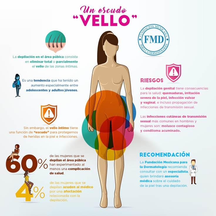 La especialista indicó que dicha depilación altera la barrera cutánea, lo cual ocasiona pequeños traumatismos sobre la piel y predispone a contraer microorganismos que infecten el área e incluso, se estima que el 60 por ciento de las mujeres que se depilan han manifestado complicaciones de salud. Alteró también sobre el riesgo de contraer infecciones de transmisión sexual por ésta práctica, ya que los folículos abiertos o los cortes incrementan la posibilidad de contraer condilomas (verrugas o papilomas) e irritación.