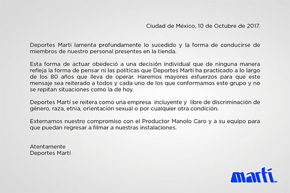 “Esta forma de actuar obedeció a una decisión individual que de ninguna manera refleja la forma de pensar ni las políticas que Deportes Martí ha practicado a lo largo de los 80 años que lleva de operar”, dijo la empresa a través de un comunicado.