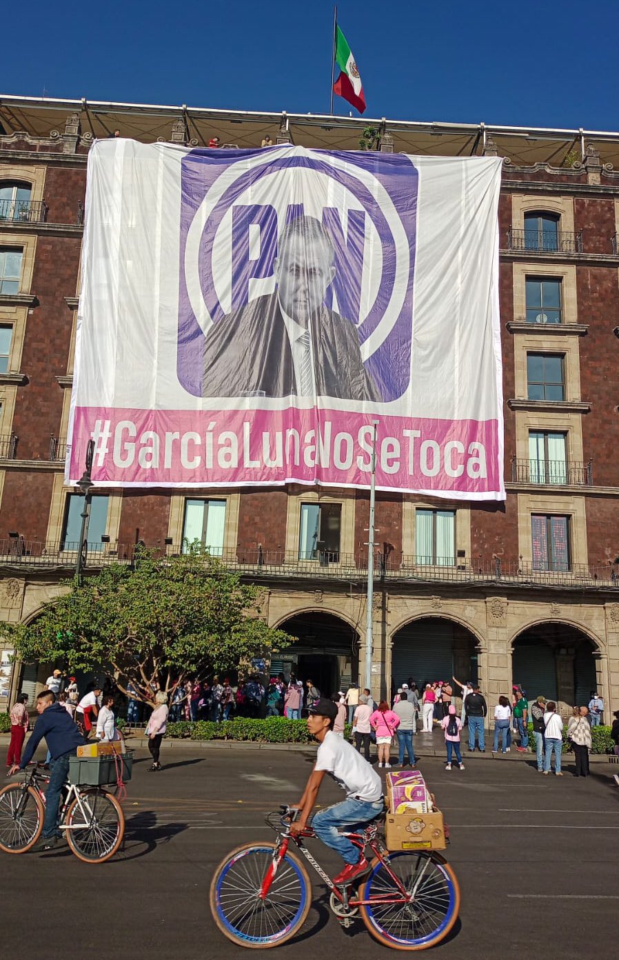 La manta mostraba el logo del PAN y una fotografía del exsecretario durante el gobierno de Felipe Calderón Hinojosa, así como con la leyenda “García Luna no se toca”.