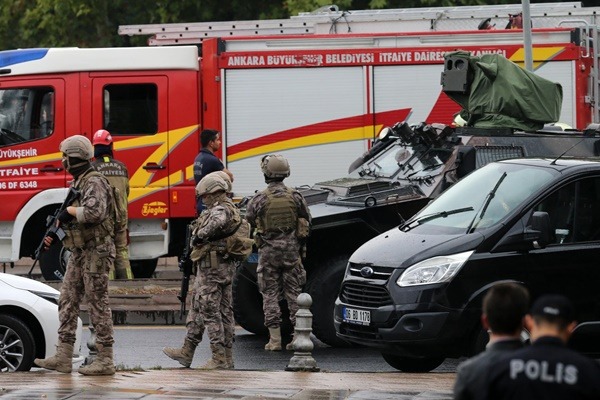 Ankara (Turkey), 01/10/2023.- Turkish soldiers secure the site of an attack near the Interior Ministry in Ankara, Turkey, 01 October 2023. According to the Turkish Minister of Interior Ali Yerlikaya, two police officers were injured when two people carried a bomb attack outside the ministry’s gate, adding that one of the attackers blew himself up and the other was ‘neutralized’ by security forces. The ministry is located close to the Turkish parliament which was due to reopen on 01 October with a speech by Turkey’s President Recep Tayyip Erdogan. (Turquía) EFE/EPA/NECATI SAVAS