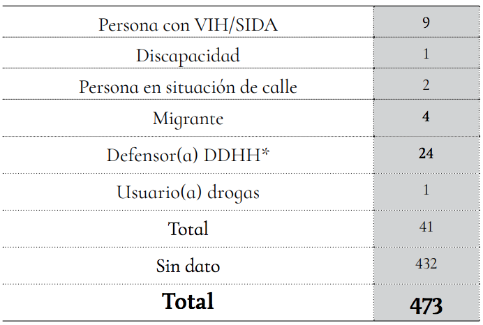 A a este grupo le siguen los hombres gay/homosexuales, con 192 casos, 40 por ciento del total. Así mismo, se registraron los feminicidios de 9 mujeres lesbianas; los homicidios de 5 hombres bisexuales, o percibidos como tales; y el feminicidio de una mujer bisexual o percibida como tal.