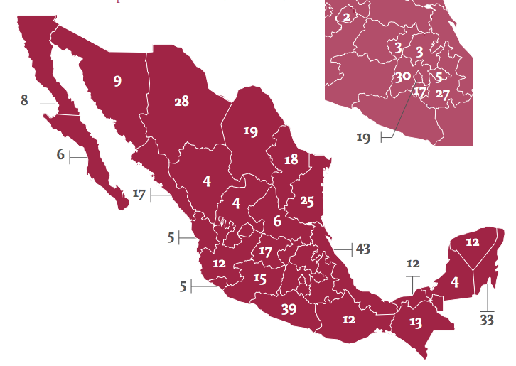 En cuanto a la distribución geográfica, Veracruz encabeza la lista con al menos 43 asesinatos; seguido por Guerrero con 39; Quintana Roo con 33; Estado de México con 30; Chihuahua con 28; Puebla con 27, y Tamaulipas con 25. Estos siete estados concentran casi la mitad de los asesinatos LGBT.