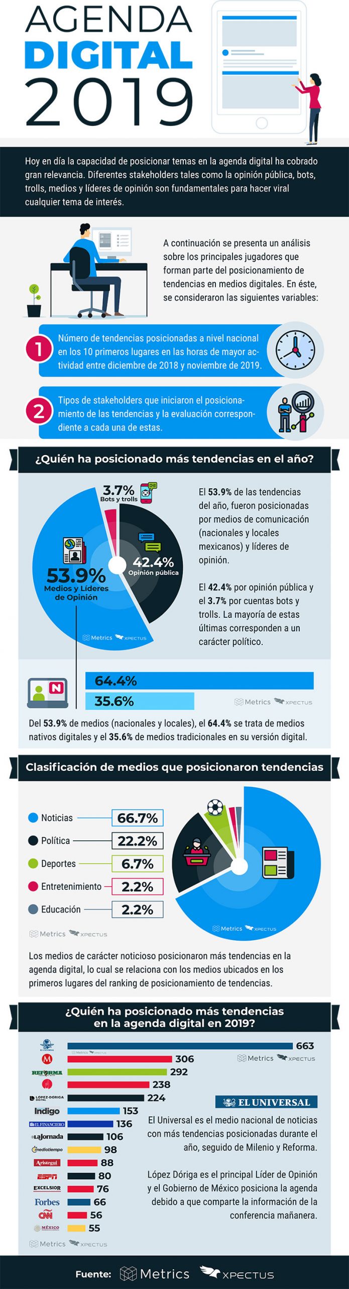 Según el análisis de la agencia, el 53.9 por ciento de las tendencias colocadas entre diciembre de 2018 y noviembre de 2019, fueron posicionados por los medios y líderes de opinión; el 42.4 por ciento por la opinión pública; y el 3.7 restante fue impulsado por bots y trolls, la mayoría de estos últimos temas fue con una posición política.