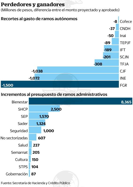 Del gasto aprobado destacó una reducción por 4 mil 282 millones de pesos a los órganos autónomos, y el más afectado será el Instituto Nacional Electoral (INE), al que se le recortaron, con relación a lo solicitado por ese organismo, mil 72 millones de pesos.