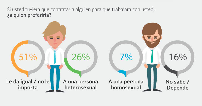 Además, 26 % de los encuestados dijeron que preferirían contratar a una persona heterosexual, mientras el resto indicó que la contratación sólo dependería de las habilidades de la persona.