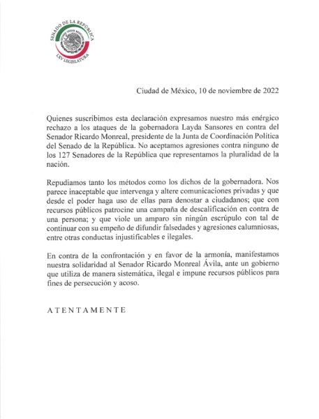 Fue a través de un pronunciamiento, los legisladores expresaron que: “No aceptamos agresiones contra ninguno de los 127 Senadores de la República que representamos la pluralidad de la nación”, suscribieron con énfasis , también por la vía escrita.
