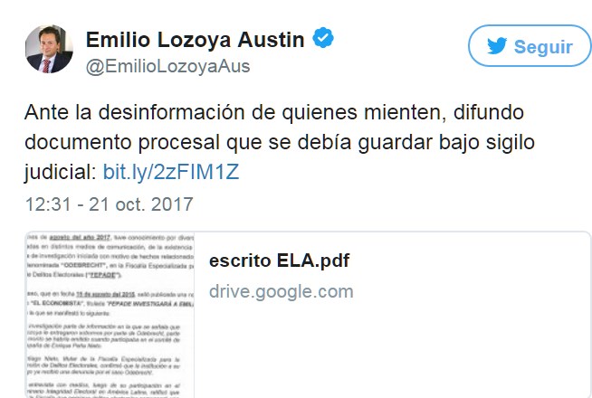 El documento completo del que se han extraído estos párrafos fue publicado por el propio Lozoya Austin, a través de su cuenta de twitter, en este enlace: bit.ly/2zFIM1Z
