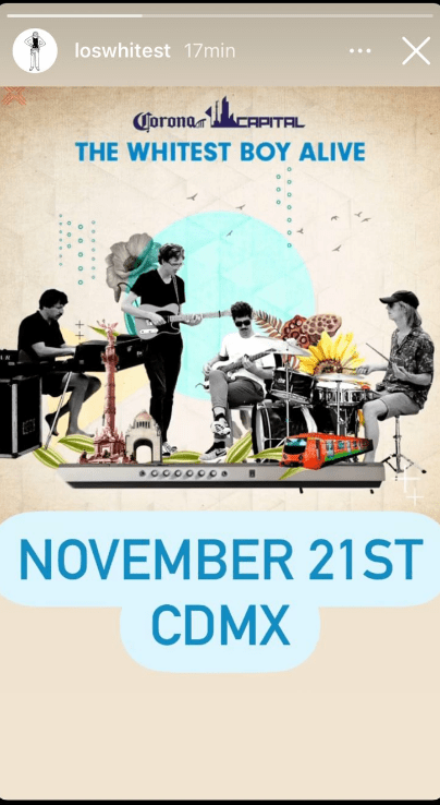⇒ Este viernes, Whitest Boy Alive —liderado por Erlend Øye— subió a sus historias de Instagram un arte donde dieron a conocer a sus seguidores que formarán parte del cartel del Corona Capital 2021. De acuerdo con la storie, se presentarán el próximo 21 de noviembre.