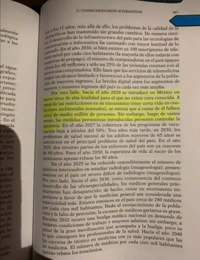 Lo que se prospecta en el libro Los futuros de la salud en México 2050, no se refiere nada más al virus, dice que una población mayor de 65 años, antes de 2035, necesitará de más médicos geriatras, además podría prevalecer una sociedad depresiva ante las carencias, y sabemos que la depresión nos inmoviliza.