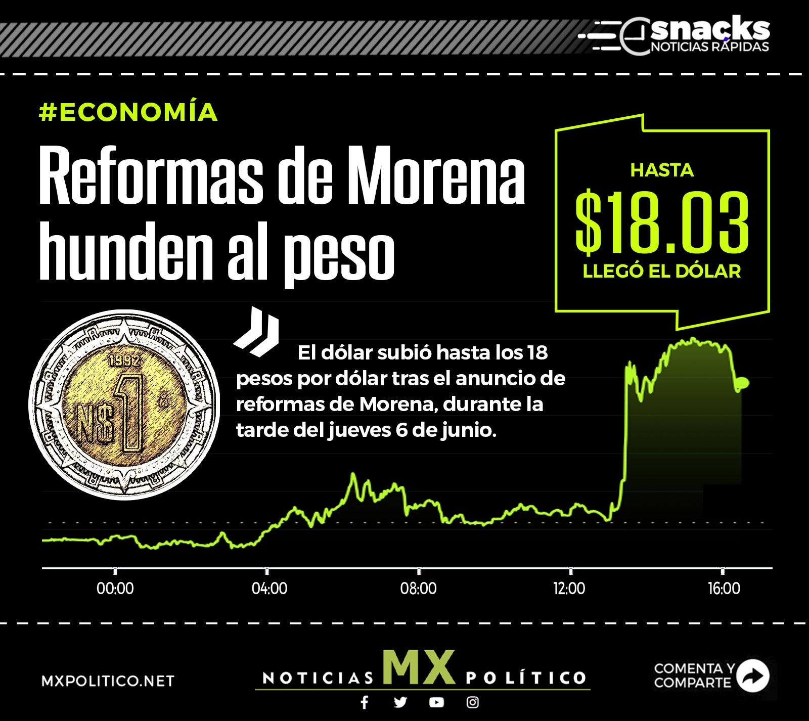 El 6 de junio de 2024, el peso mexicano sufrió una caída significativa, cerrando en 17.8881 pesos por dólar, tras el anuncio de Morena sobre la aprobación de 18 reformas constitucionales propuestas por el presidente Andrés Manuel López Obrador (AMLO). Esta caída representa un descenso del 2.025%, según datos del Banco de México.