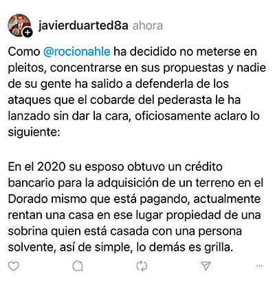 Dice el propio Duarte de Ochoa que el esposo de la ex secretaría de Energía, José Luis Peña Peña obtuvo en 2020 un crédito bancario mismo que al día de hoy está pagando por la adquisición de un terreno en el Fraccionamiento El Dorado, hecho comprobable.