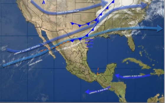 Se pronostican tormentas locales fuertes para Tamaulipas; lluvias con intervalos de chubascos para Nuevo León, Veracruz, Chiapas y Tabasco, y lloviznas para San Luis Potosí, Guanajuato, Querétaro, Hidalgo, Puebla, Estado de México, Oaxaca, Campeche y Quintana Roo.