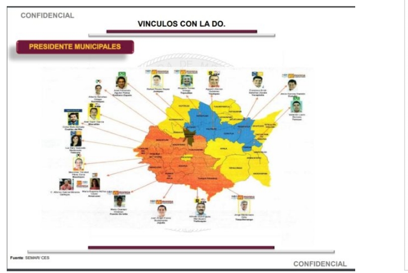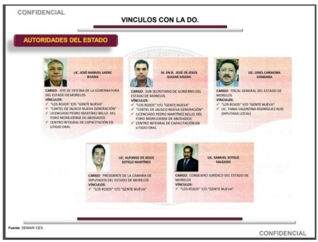 La Semar afirma que dichas autoridades o representantes populares, algunos de los cuales ya dejaron sus cargos, mantienen vínculos con cuatro organizaciones que operan en la entidad: el Cártel Jalisco Nueva Generación (CJNG), Guerreros Unidos, El Comando Tlahuica y “Los Rojos”, una escisión del Cártel de los Beltrán Leyva que se afianzó en gran parte del estado de Morelos.