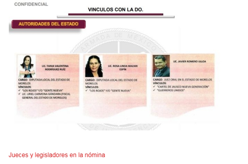 Se señala al menos a dos secretarios del gabinete actual del gobernador de Morelos, Cuauhtémoc Blanco, el Fiscal General del Estado, 18 alcaldes, dos diputados locales, un senador y un juez estatal, quienes estarían vinculados con células del crimen organizado que operan en la entidad, revela un informe de inteligencia elaborado por la Secretaría de Marina-Armada de México (Semar) en 2019.