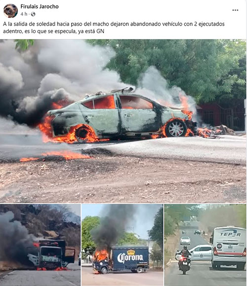 Pero tal vez el caso más burdo ha sido el supuesto ataque en Soledad de Doblado, en donde mencionaron el presunto homicidio de dos personas y vehículos siniestrados, a donde llegó esto que hicieron circular imágenes dramáticas y alarmantes de un tiroteo, que luego se comprobó pertenecían a eventos ocurridos tiempo atrás… en Michoacán. Link del día 24/05/2025 evento de Michoacán. https://moreliactiva.com/narcoenfrentamientos-dejan-al-menos-6-vehiculos-quemados-en-bloqueos-carreteros-en-tierra-caliente/