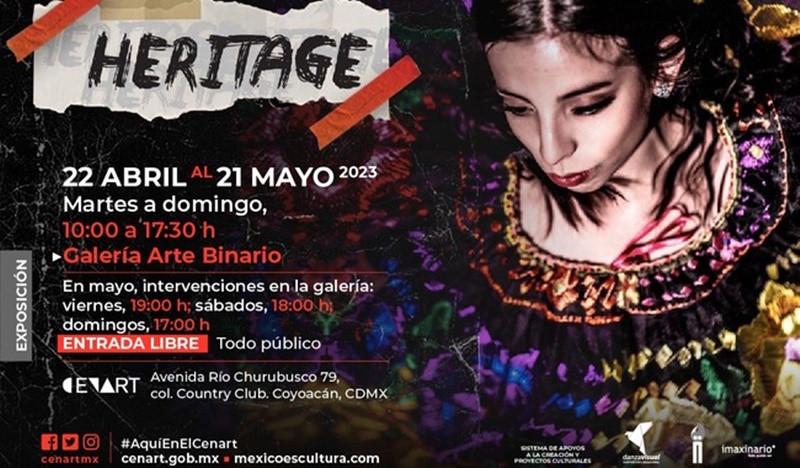 La exposición Heritage será inaugurada el sábado 22 de abril, a las 10:00 horas, en la Galería Arte Binario del Cenart, donde permanecerá en exhibición hasta el 21 de mayo de 2023, con entrada libre. Durante mayo se llevarán a cabo intervenciones de artistas que forman parte de Danza Visual los viernes, a las 19:00 horas; sábados, a las 18:00 horas; y domingos, a las 17:00 horas. El programa completo de actividades se puede consultar en cenart.gob.mx.