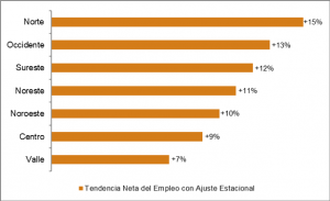 Empleadores en la región Norte esperan el ritmo de contratación más activo para el tercer trimestre, con una Expectativa Neta de Empleo de +15%, seguido por la región Occidente que reporta +13% y Sureste con +12%. Las regiones Noreste y Noroeste se ubican en +11% y +10%, respectivamente.