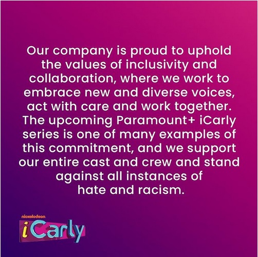 “En iCarly estamos orgullos de ser racialmente diversos, no sólo en nuestro equipo, sino en nuestro elenco. Recientemente hemos visto reportes de racismo hacia un miembro del cast de iCarly y no es aceptable. Por favor, piensen sus palabras y tómense un tiempo para entender cómo lo que dicen puede afectar a otras personas.”