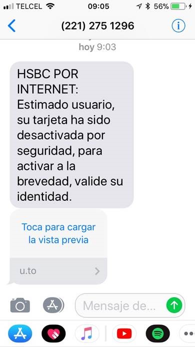 A través de un mensaje de texto (SMS), indican al usuario que su tarjeta fue desactivada por seguridad y para activarla, debe validar su identidad. Mediante este engaño, los delincuentes buscan obtener los datos sensibles del usuario como número de tarjeta, NIP, entre otros; con la finalidad de vaciar su cuenta, o bien, realizar consumos con cargo a la tarjeta o a la cuenta del usuario. Cabe destacar que el número telefónico del cual llega el supuesto mensaje de HSBC es el 221 275 1296.