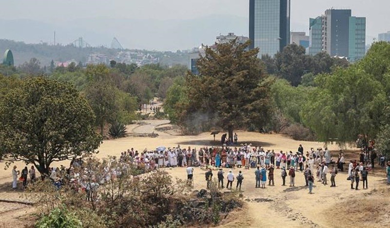 Ciento doce representantes de los pueblos kumiai, totonaca, wixárika, nahua y otomí se reunieron en este sitio patrimonial del sur la Ciudad de México, para realizar ofrendas, danzas mexicas y oraciones dirigidas a Tláloc, y a los cuatro elementos primordiales: el agua, el viento, el fuego y la tierra, para terminar con la temporada de sequía que azota al país y a gran parte del mundo.