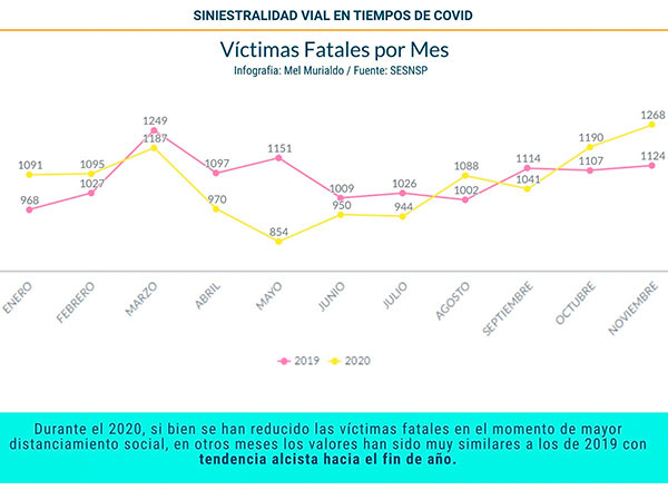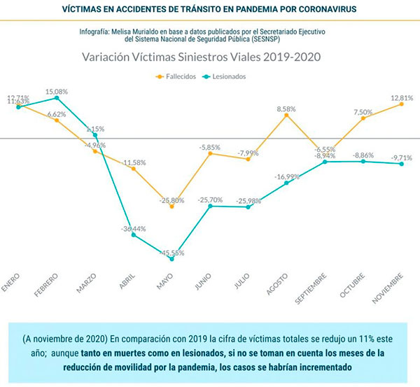Hasta la fecha, han muerto 35 personas por día en accidentes de tránsito en el país. A pesar de la disminución en la circulación debido a la pandemia de coronavirus, los accidentes de tránsito parecen no dar tregua en el país. De acuerdo al relevamiento realizado por Melisa Murialdo, el total de víctimas (lesionados y fallecidos) a noviembre de 2020 contra el mismo período de 2019 muestra una disminución de un 11% y las muertes por sí solas solamente se redujeron un 1,65%. Teniendo en cuenta que diciembre históricamente es uno de los meses con mayor cantidad de siniestros viales, la analista anticipa que la pandemia del coronavirus no va a poder contra los siniestros viales en México, ya que la cantidad de fallecidos continuará rondando las 1000 víctimas fatales al mes.