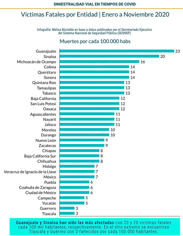 A pesar de ello, la fatalidad no disminuye de manera proporcional en todos, reflejando que, en cuanto a las entidades con mayor impacto de estos siniestros, de enero a noviembre; Guanajuato y Sinaloa han sido las más afectadas con 23 y 20 víctimas fatales cada 100 mil habitantes, respectivamente. En el otro extremo se encuentran Tlaxcala y Guerreo con 3 fallecidos por cada 100.000 habitantes.