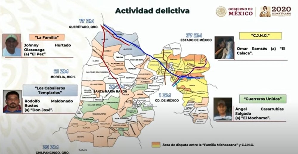 Resaltó que el Gobierno federal ha detectado que el CJNG opera en la zona conurbada del oriente de la CDMX, mientras que se descubrió una la alianza entre La Familia y los Caballeros Templarios para cerrarle el paso a la expansión en los municipios mexiquenses del sur a Guerreros Unidos.