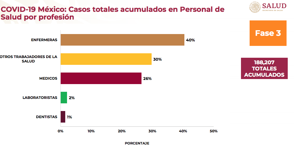 En primer lugar se encuentran las enfermeras, que representan el 40 por ciento de las estadísticas; seguidos de otros trabajadores de la salud, que son el 30 por ciento; los médicos con el 26 por ciento; los laboratoristas corresponden al dos por ciento y los dentistas ocupan el uno por ciento. Además hay 218 defunciones sospechosas.