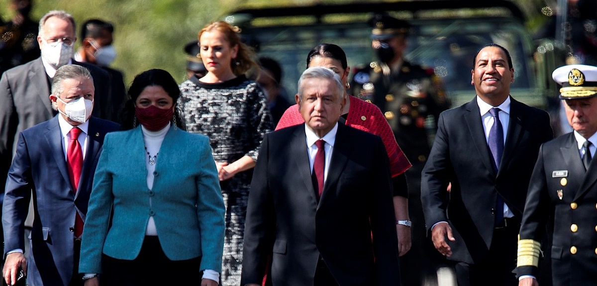 López Obrador estuvo acompañado en el presidio del evento por su esposa, la escritora Beatriz Gutiérrez; Luis Cresencio Sandoval, Secretario de la Defensa Nacional; José Rafael Ojeda, Secretario de Marina y Jesús Ramírez Cuevas, vocero de Presidencia; ninguno de ellos portaba mascarilla.