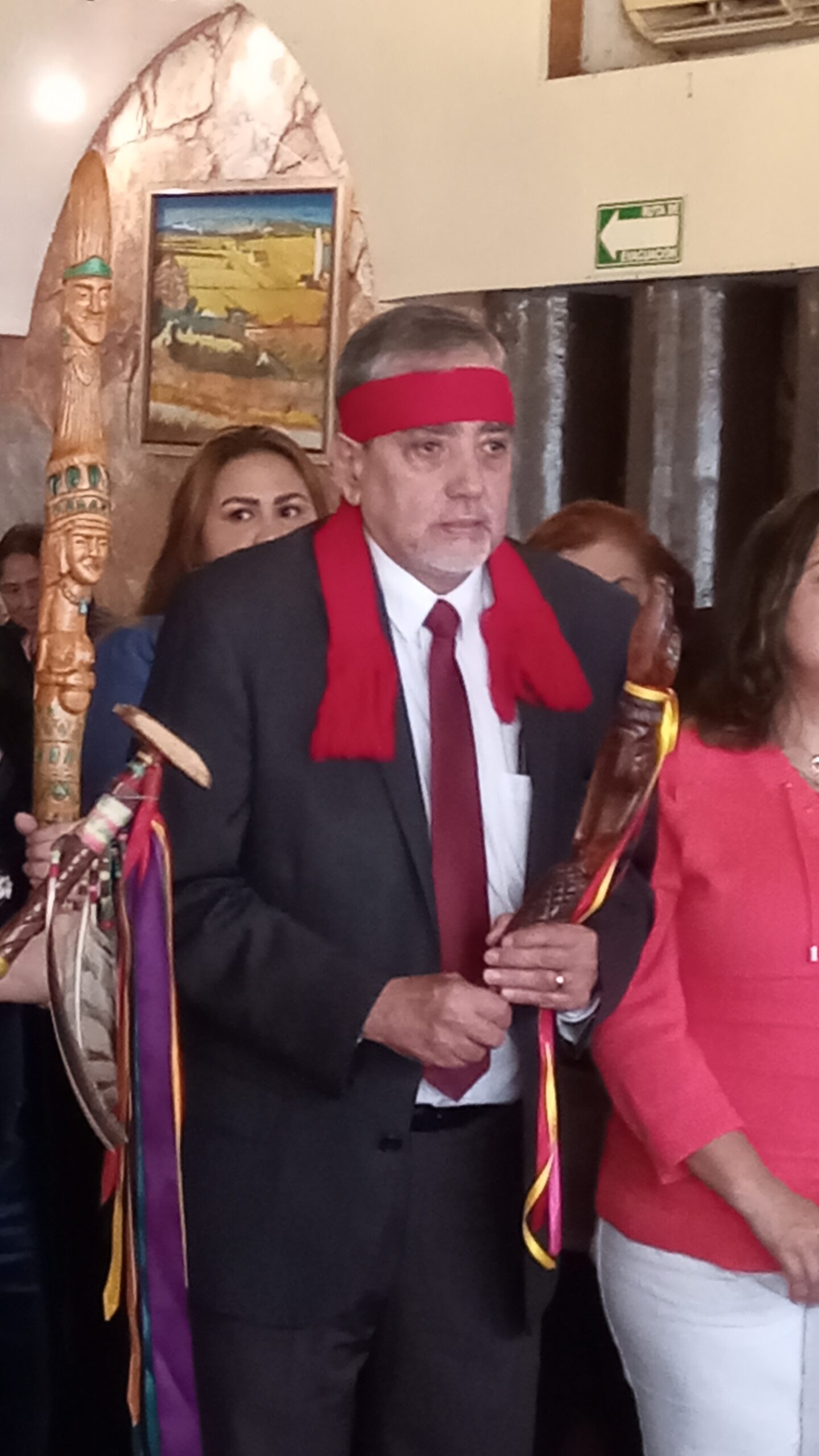 La ceremonia de entrega fue iniciada por el Tehuaque Inguiva de Puebla, Jorge Negrete Cedillo Chimalli, Presidente del Concejo Federal Indígena, quién hacía sonar un caracol, una ocarina, y un teponaxtle, y también fue sahumeando el lugar con humo de incienso.
