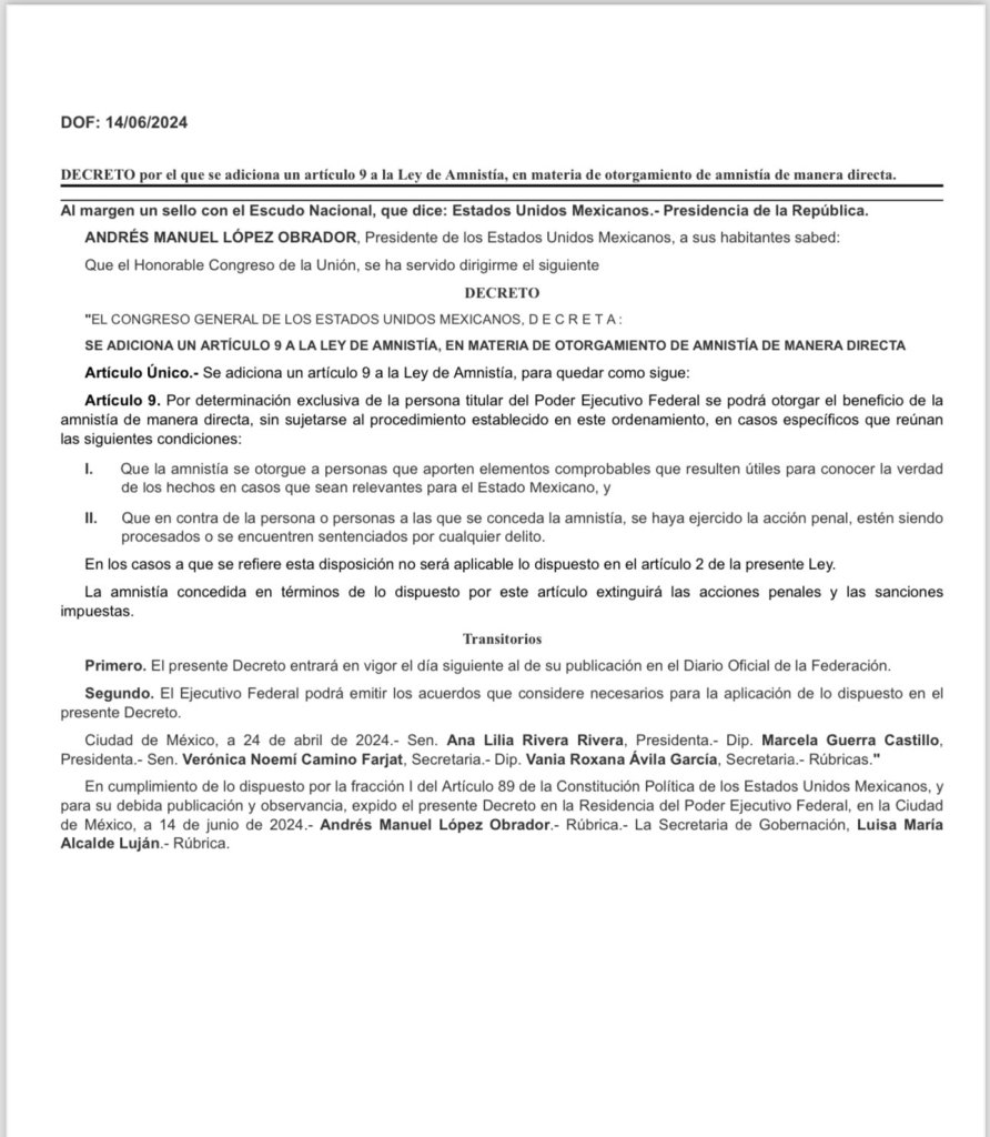 La Secretaría de Gobernación publicó en el Diario Oficial de la Federación (DOF) el decreto de reformas a la Ley de Amparo y la Ley de Amnistía. Estas reformas otorgan al Presidente de la República la facultad de otorgar amnistías de manera directa y modifican la capacidad de los jueces para suspender leyes generales y obras públicas.