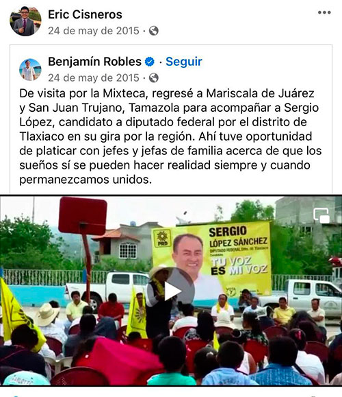 Ahí el 24 de mayo de 2015, posteaba las declaraciones del hoy diputado federal por Morena, Benjamín Robles, quien en ese momento apoyaba a Sergio López, candidato a diputado federal por el PRD por el distrito de Tlaxiaco en su gira por la región.