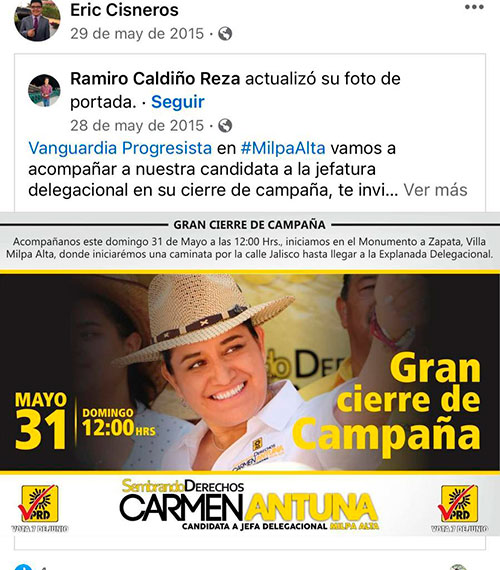 De igual modo, el 29 de mayo de ese mismo 2015, Cisneros Burgos nada convencido de fundar Morena, promovía abiertamente la campaña política por el PRD de Carmen Antuna a jefa delegacional en Milpa Alta en la Ciudad de México como se demuestra en este link