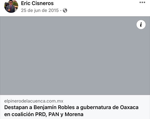 El 25 de junio de ese mismo activo año proselitista a favor del PRD, el defensor de la negritud veracruzana, posteaba una publicación del Diario El Piñero de la Cuenca en la que se anunciaba “Destapan a Benjamín Robles a la Gubernatura de Oaxaca en Coalición PRD, PAN y Morena” como demuestra también el siguiente enlace https://www.facebook.com/eric.cisneros.9678/posts/378241692372736
