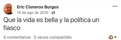 Es increíble como el mismo Cisneros Burgos se expresaba de la política el 19 de agosto de 2010, afirmaba en sus redes sociales, “Qué la vida es bella y la política un fiasco” ahora que pelea por aparecer en la encuesta por alcanzar el cargo de Coordinador Estatal de la 4T, dice lo contrario.