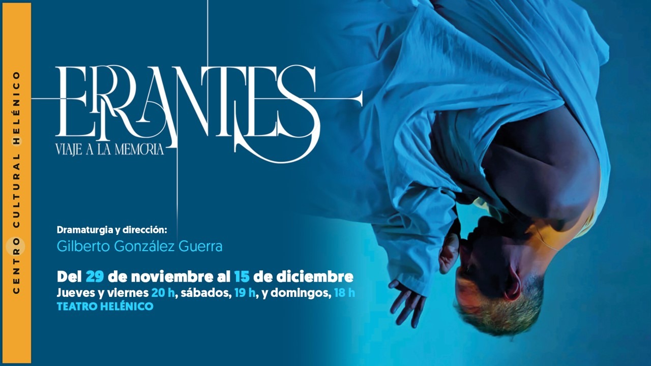 Errantes, Viaje a la memoriase presentará jueves y viernes, a las 20:00 h; sábados a las 19:00 h y los domingos a las 18:00 hasta el 15 de diciembre en Centro Cultural Helénico con las actuaciones de Juan Ramírez, Emmanuel Fragoso y Gilberto González Guerra.