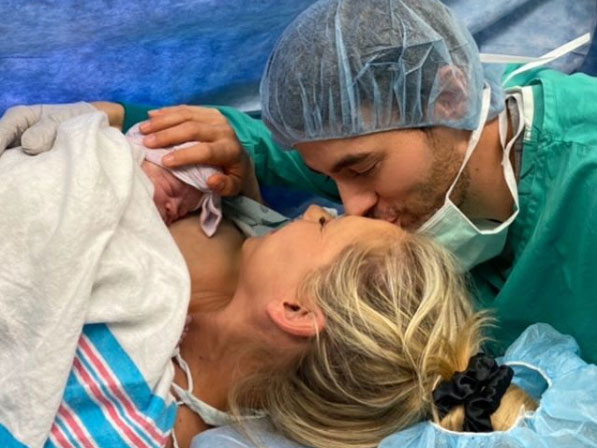 En la foto se aprecia que el orgulloso papá estuvo presente en el alumbramiento por la bata de hospital, el cubre bocas y la malla en l cabeza que lleva puesta. A pesar de ello se nota la evidente felicidad del papá.