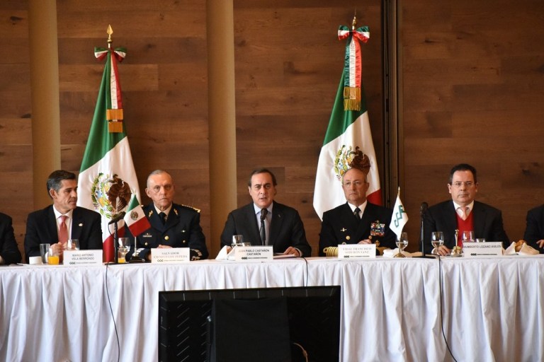 Juan Pablo Castañón, Presidente del Consejo Coordinador Empresarial (CCE), sostuvo un encuentro privado con el general Salvador Cienfuegos, secretario de la Defensa Nacional, y con el almirante Vidal Francisco Soberón, secretario de Marina, donde les entregó un reconocimiento por su importante labor en el combate a la delincuencia y el crimen organizado, a 10 años de que salieron a las calles.
