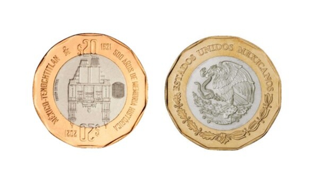 La tercera moneda de 20 pesos es por los 500 años de la Resistencia Indígena, tiene un diseño que forma un reflejo: la Catedral Metropolitana y el Templo Mayor, y la denominación “$20”. El Templo Mayor como imagen latente y el micro texto “FUSIÓN CULTURAL”. Además, incluye la leyenda “500 AÑOS DE MEMORIA HISTÓRICA DE MEXICO-TENOCHTITLAN”.