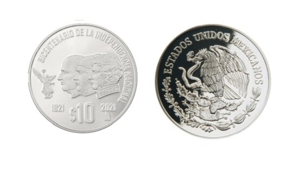 Con respecto a las monedas de 10 pesos, la relacionada con la Independencia mexicana tiene al centro, las efigies de perfil de Miguel Hidalgo, José María Morelos y Vicente Guerrero. A la izquierda, el perfil de la Victoria Alada que remata el Ángel de la Independencia. En la parte superior, siguiendo el contorno, la leyenda “BICENTENARIO DE LA INDEPENDENCIA NACIONAL”.