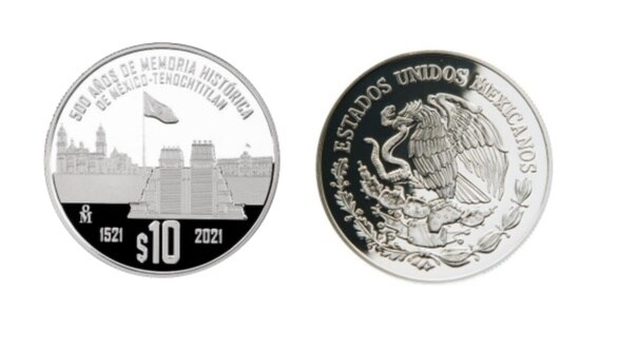 La tercer moneda de 10 pesos tiene al frente y desfasado ligeramente a la derecha, el Templo Mayor. Al fondo, está la Plaza de la Constitución con la Bandera Nacional, el Palacio Nacional y la Catedral y Sagrario Metropolitanos. En el contorno superior, en dos líneas, la leyenda “500 AÑOS DE MEMORIA HISTÓRICA / DE MÉXICO-TENOCHTITLAN”.