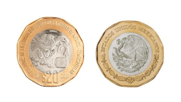 Con respecto a la moneda de 20 pesos para la fundación de México-Tenochtitlan tiene al centro el águila proveniente del “Teocalli de la Guerra Sagrada”, y sobre ella, el micro texto “TEOCALLI”. A la derecha, el glifo de la luna como imagen latente. En el borde superior, la leyenda “700 AÑOS DE LA FUNDACIÓN LUNAR DE LA CIUDAD DE MÉXICO-TENOCHTITLAN”.