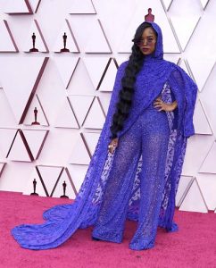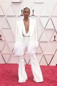 Ganadora de la mejor canción original por “Fight For You” de Judas and the Black Messiah, lució un traje personalizado azul cobalto adornado, encapuchado y un mono de pierna acampanada a juego de Dundas, con joyas Chopard y plataformas de color azul metalizado de Giuseppe Zanotti.