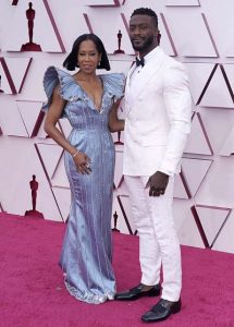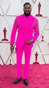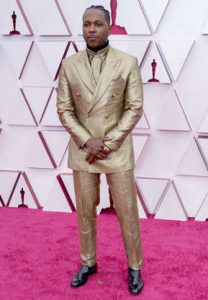 Nominado a mejor actor de reparto Leslie Odom, Jr., eligió un traje brioni personalizado hecho de hilo de seda bañado en oro de 24 quilates, con joyas de Cartier y un reloj Omega Constellation Gents de 41 mm.