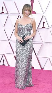 La productora de Promising Young Woman, Robbie usó un vestido personalizado de Chanel, hecho a mano de encaje metálico con espalda baja, correas delgadas y tres botones con joyas en el centro, combinado con joyas Chanel.