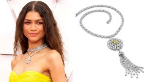 La presentadora lució un vestido amarillo de gasa de seda especialmente diseñado para ella por el director creativo de Valentino Pierpaolo Piccioli. Completó el look con más de 6 millones de dólares en diamantes Bulgari, con un total de 183,3 quilates, incluyendo un collar de diamantes amarillos, una pieza transformable con dos collares de diamantes y un broche central de eliminación y borla.