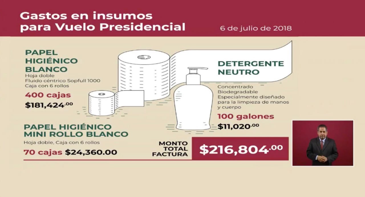.@lopezobrador_ presentó los gastos en insumos para el vuelo presidencial del día 6 de julio de 2018, correspondiente a la administración anterior, y señaló que “hay otras cosas que por decencia no presentamos, ya el papel higiénico es bastante”. pic.twitter.com/t1oZ7HR9tx