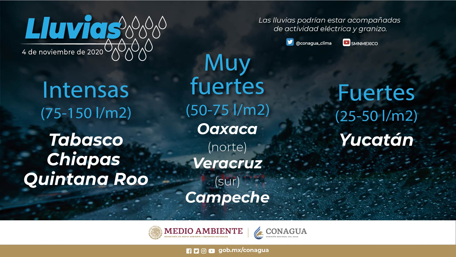 Por otro lado, las lluvias muy fuertes serán en Campeche, Oaxaca y Veracruz; y fuertes en Yucatán y Puebla.