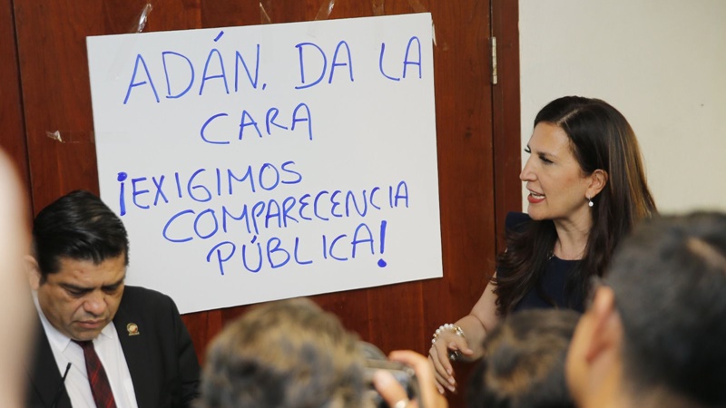 “¿Por qué nuevamente el Presidente de la República respalda a Garduño, por qué hoy no hay renuncias de primer nivel ante un crimen de Estado?”, cuestionó al mostrar un cartel con la exigencia: “Adán, da la cara. Exigimos comparecencia pública”, dirigido al funcionario.